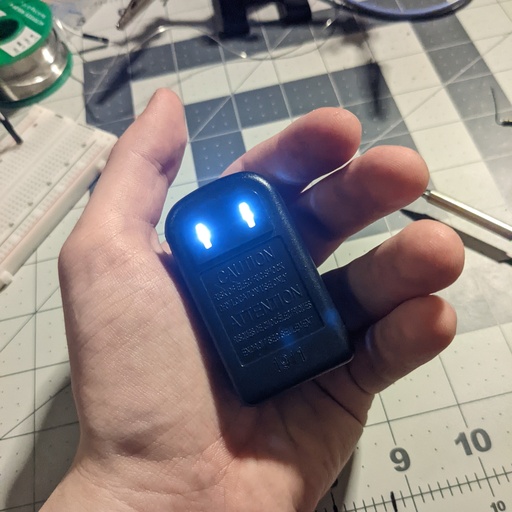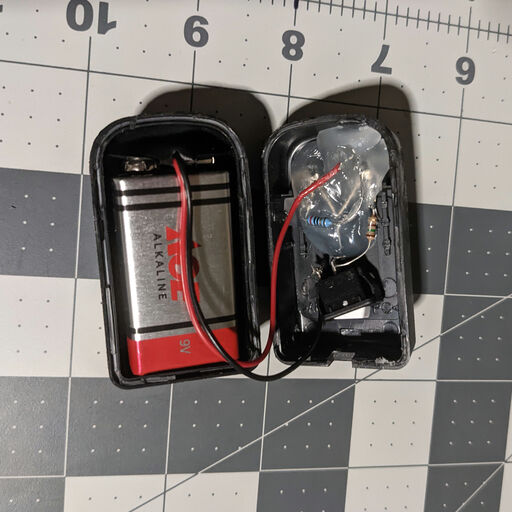I used a 9 V battery to power the two series LEDs. The 9 V serendipitously fit perfectly in the back of the case. To secure the LEDs and the respective current limiting resistor, I ended up just coating them in a thick layer of hot glue. The project was a spur of the moment thing, so taking another day to engineer a perfect solution wouldn’t make sense.