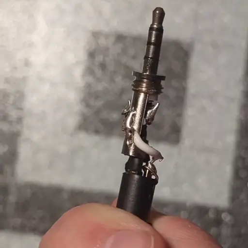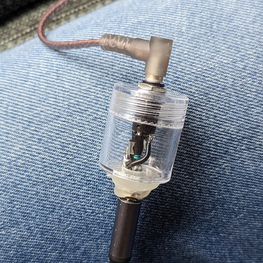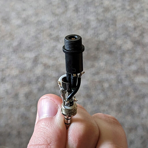 So I decided to make this. I ordered the input and output halves of a headphone jack and soldered what I needed in between. I used head shrink tubing to prevent unintended contact between the different wires. In order to protect the dongle while I’m out and about, I added some holes to a plastic jar from the dollar store and stuck it inside. I had to use some hot glue on the plug end because the jar was a little bit too short to fully house the device. In the end, it’s somewhat reminiscent of a vacuum tube, which I think is pretty neat.