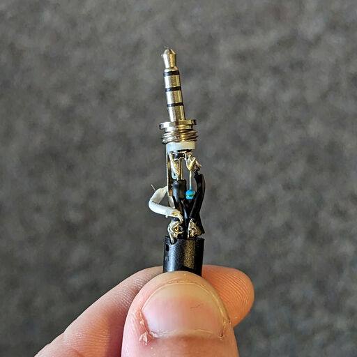 I added a 56 Ω resistor on each audio channel and two wires to connect the ground and microphone directly from one side to the other. This raises my headphones’ impedance from 24 Ω to 80 Ω. The volume is quieter, and there’s less noise from electrical interference. The output on my phone is supplying the same amount of power, but the resistors end up soaking up 70% of it, meaning that only 30% of the full power ends up reaching my the headphones.